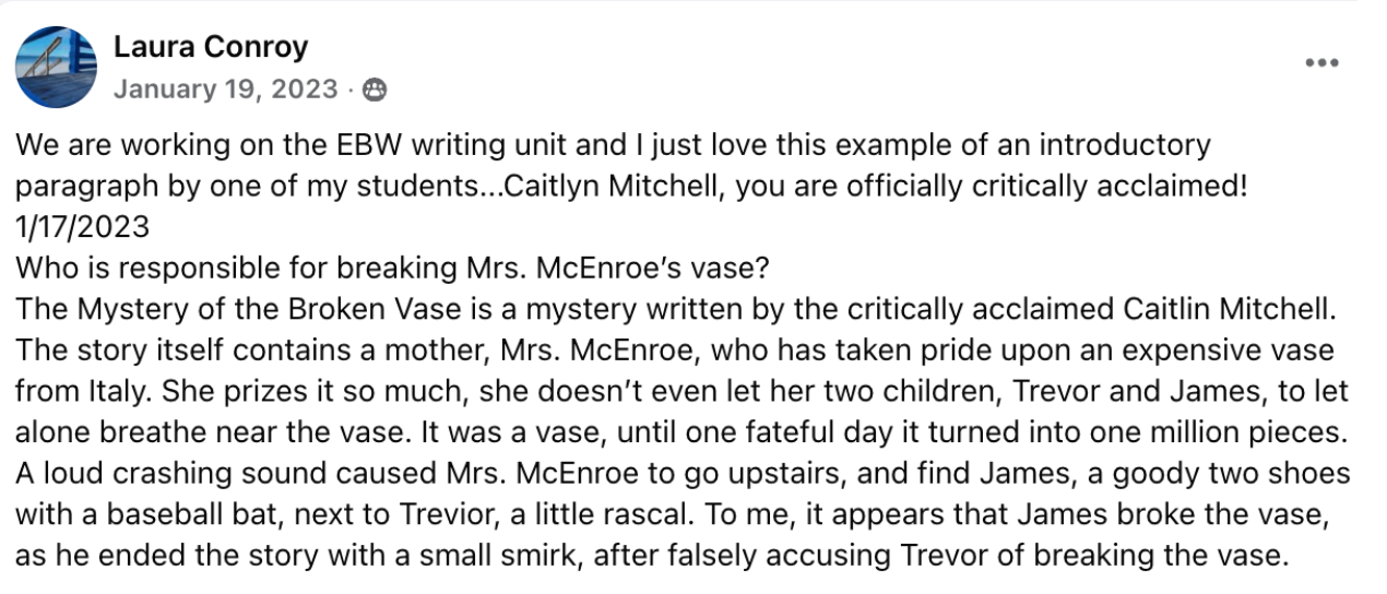 In The Mystery of the Broken Vase, students step into the role of detectives tasked with uncovering which of Mrs. McEnroe’s children is responsible for a shattered family heirloom. Along the way, they’ll practice one of the most essential (and most challenging) writing skills: justification.